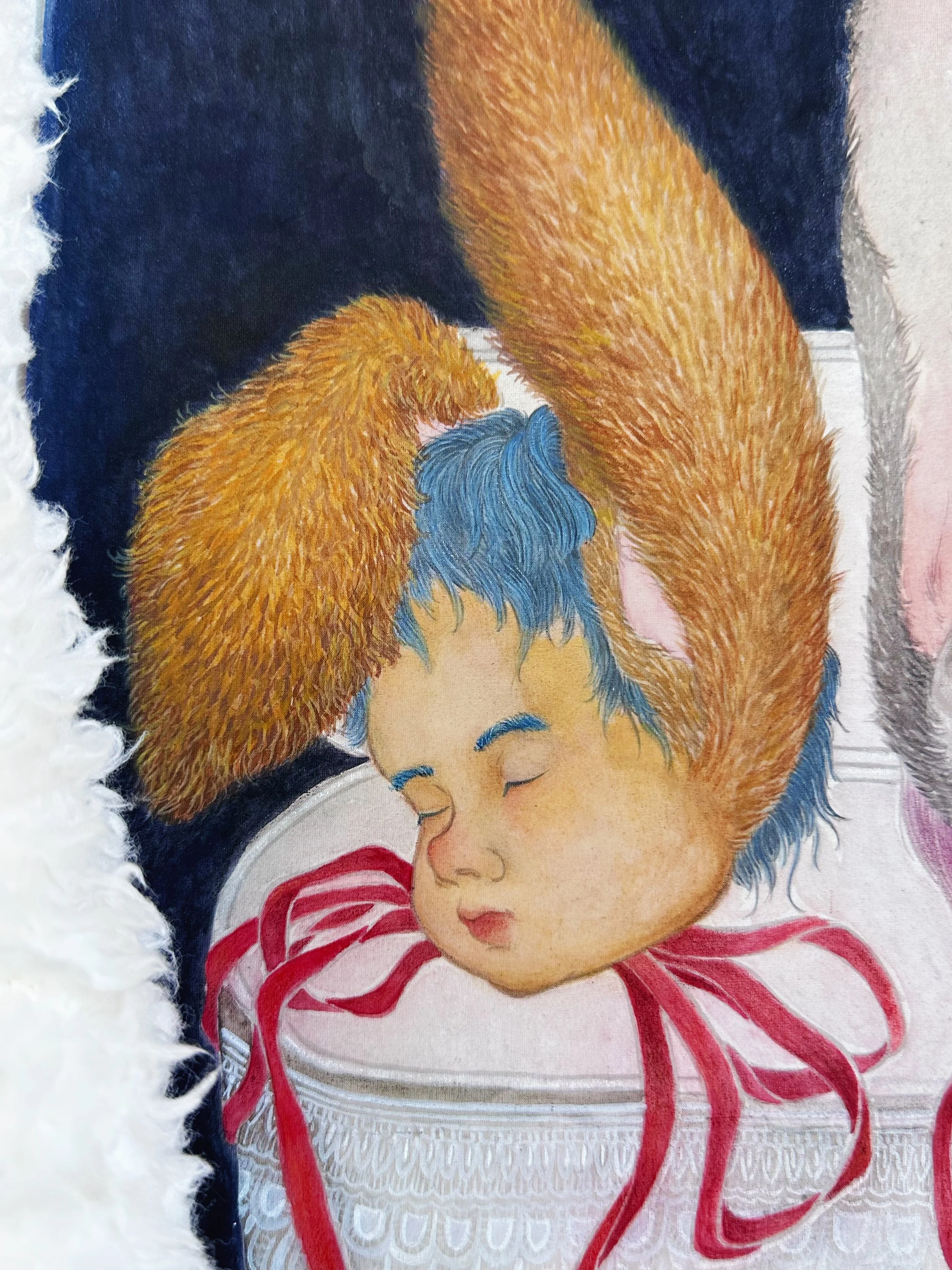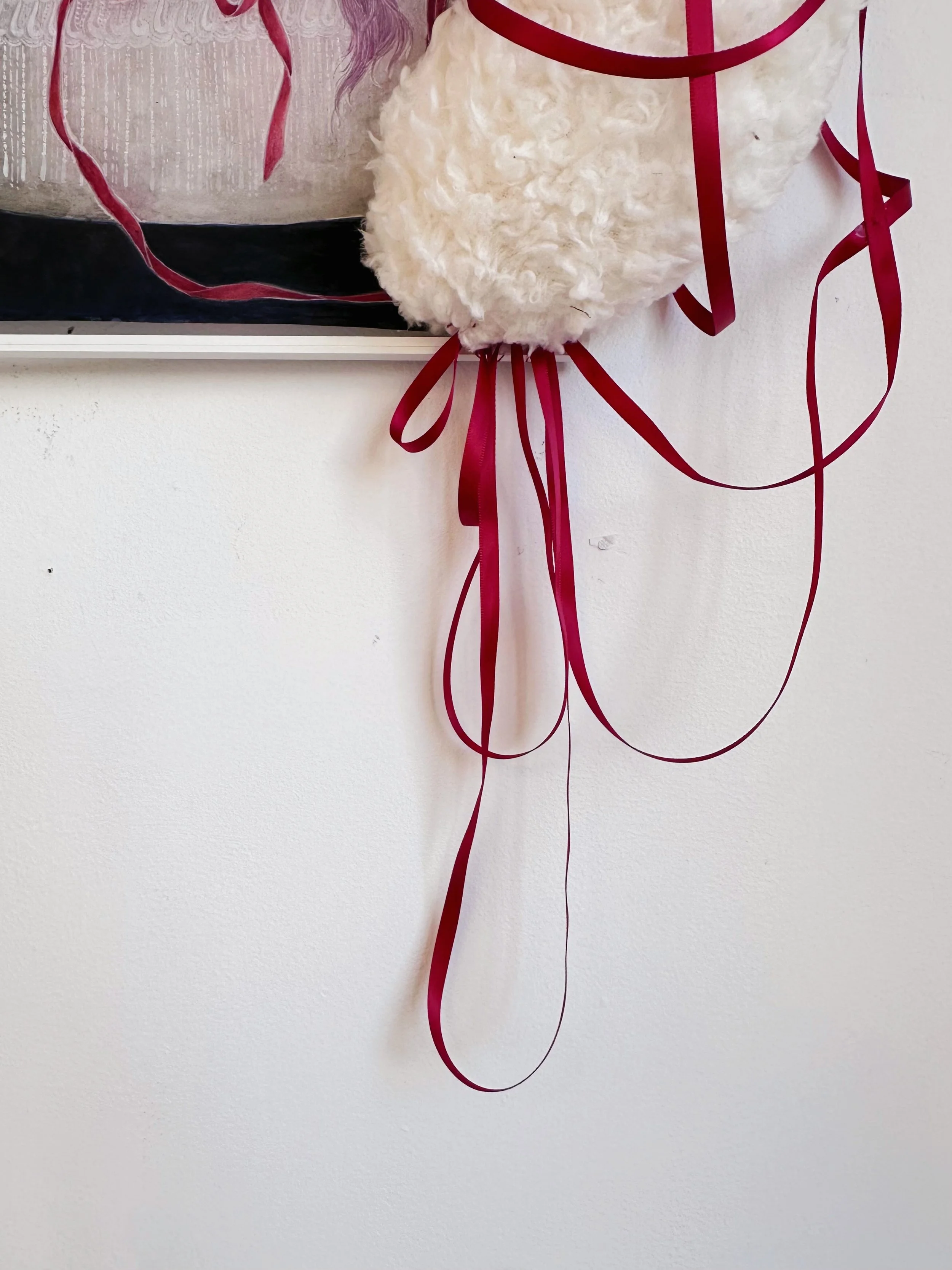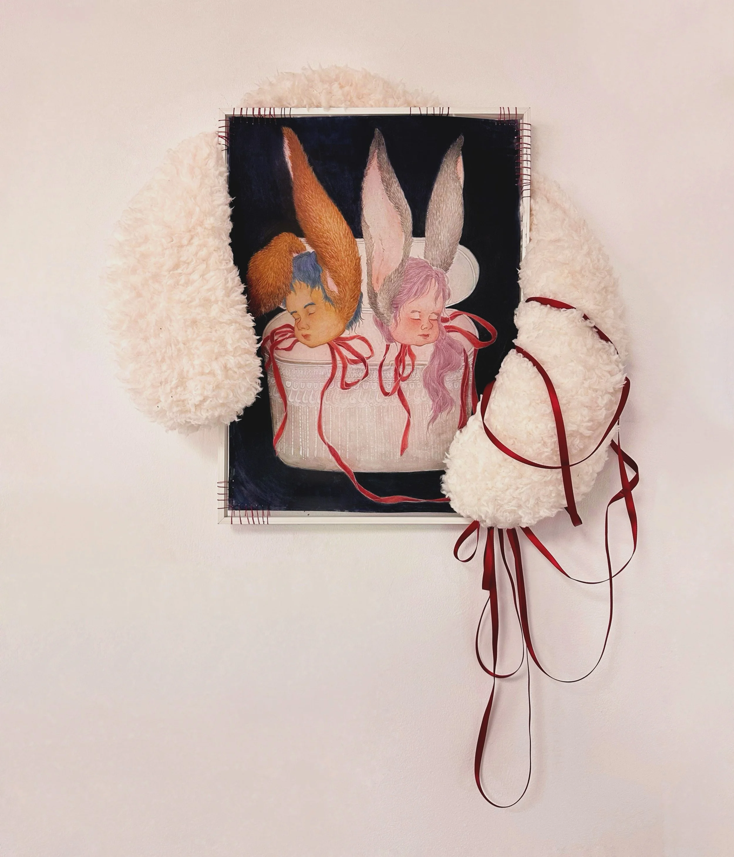 The Distance of Listening, 2024, 40 x 50 cm, Chinese painting pigments, watercolour, plush fabric and ribbon on silk