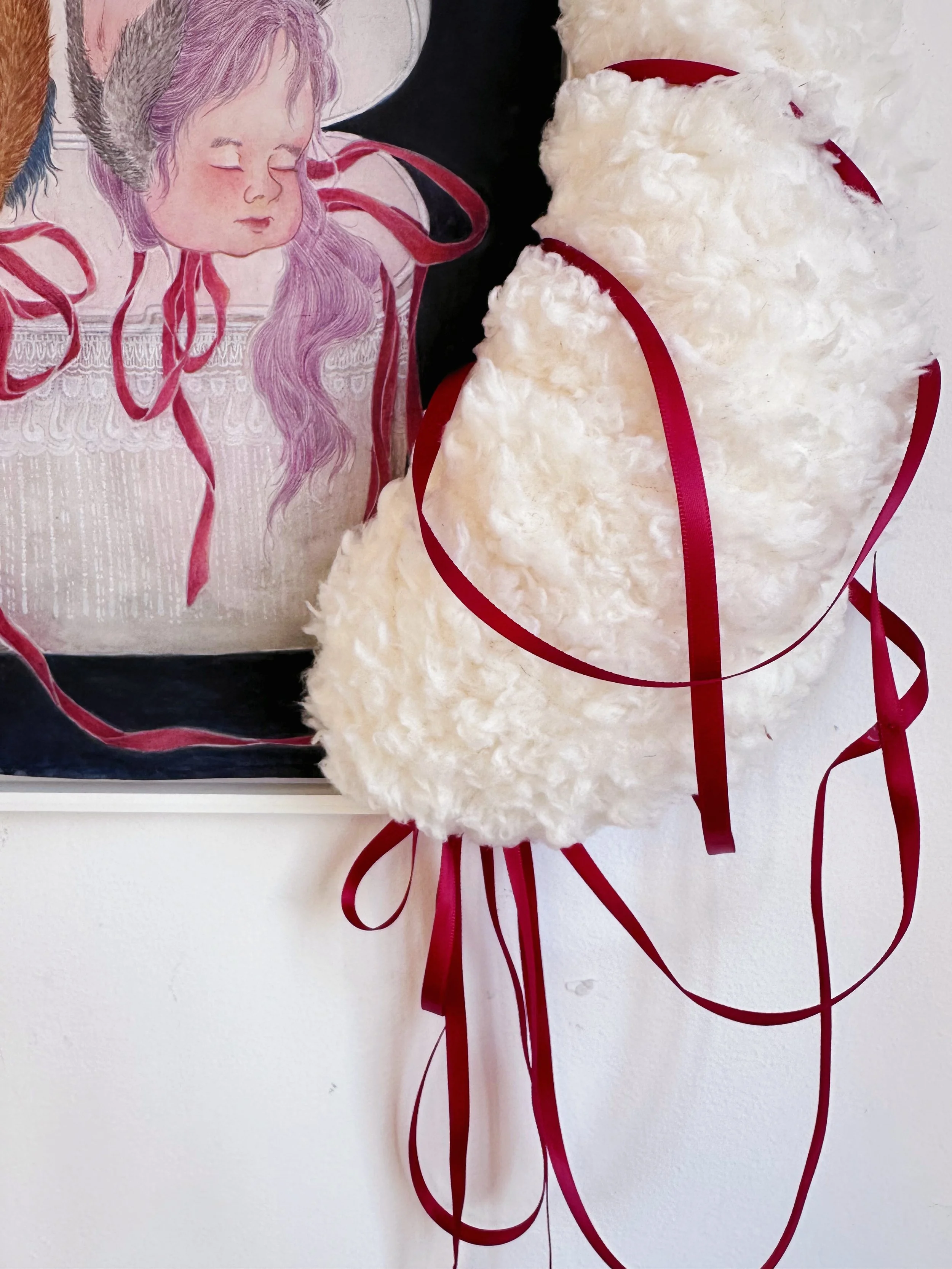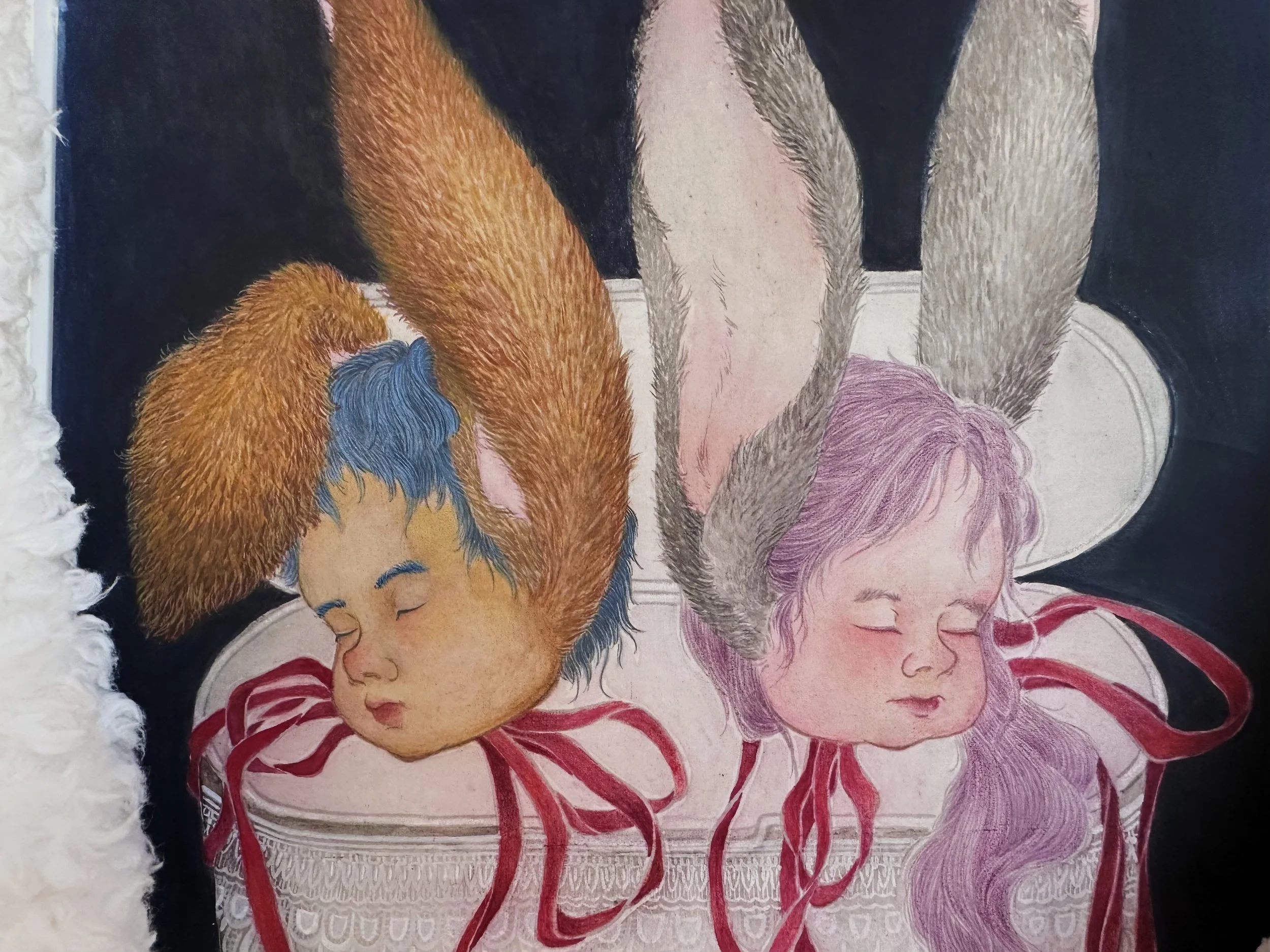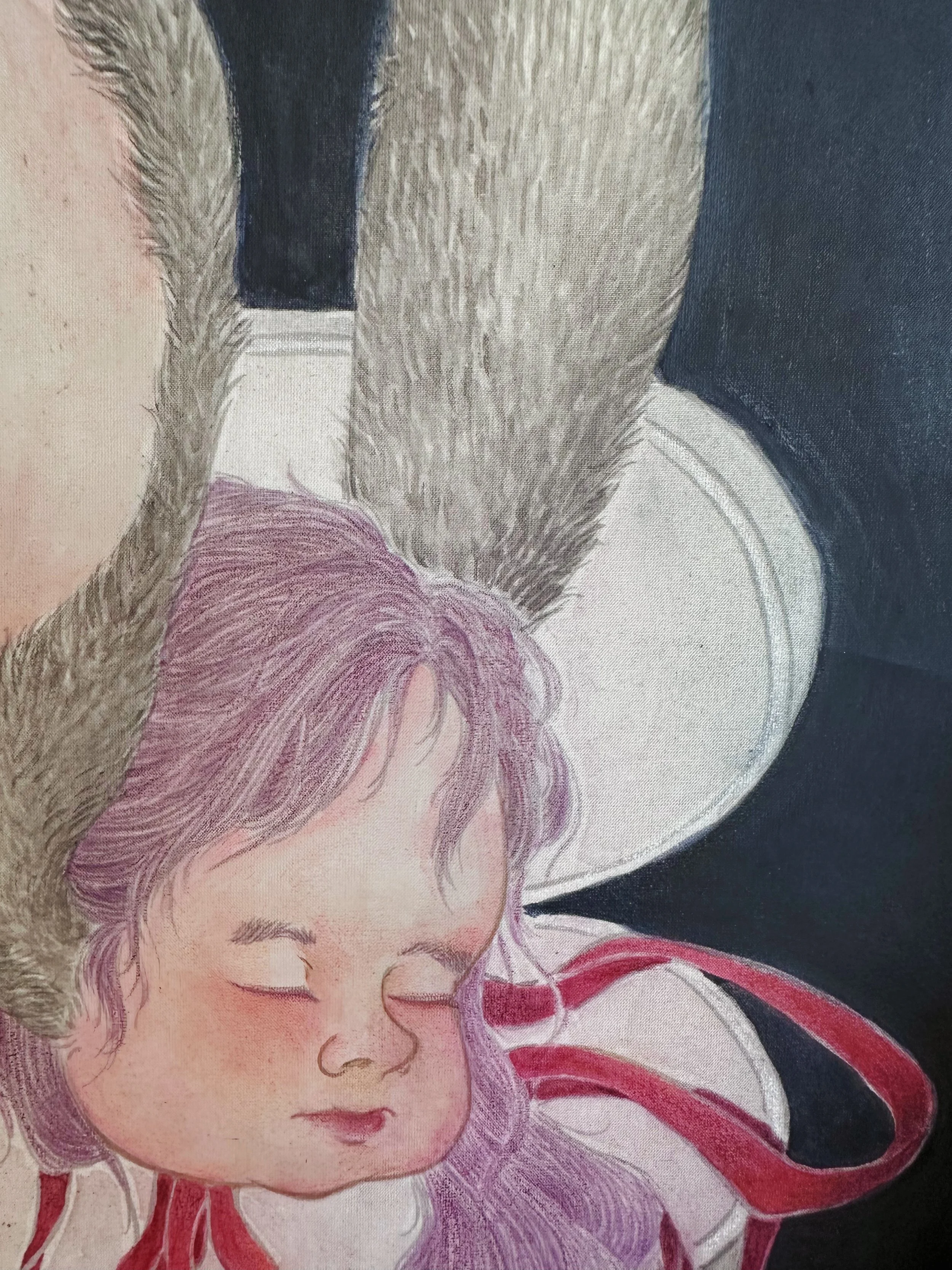 The Distance of Listening, 2024, 40 x 50 cm, Chinese painting pigments, watercolour, plush fabric and ribbon on silk