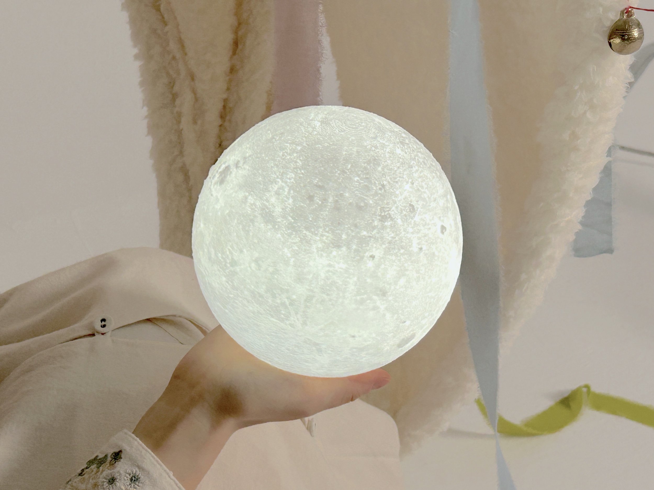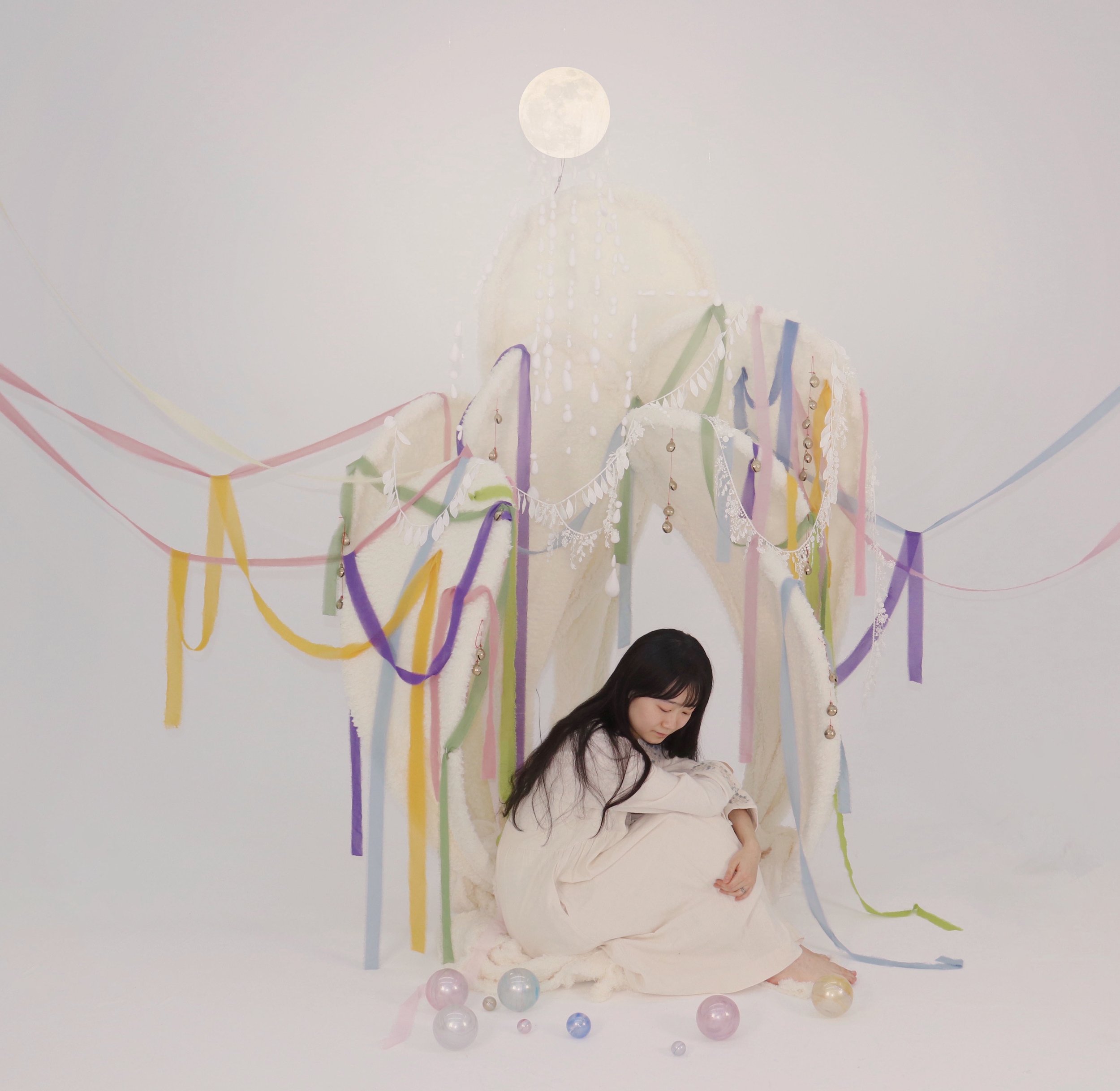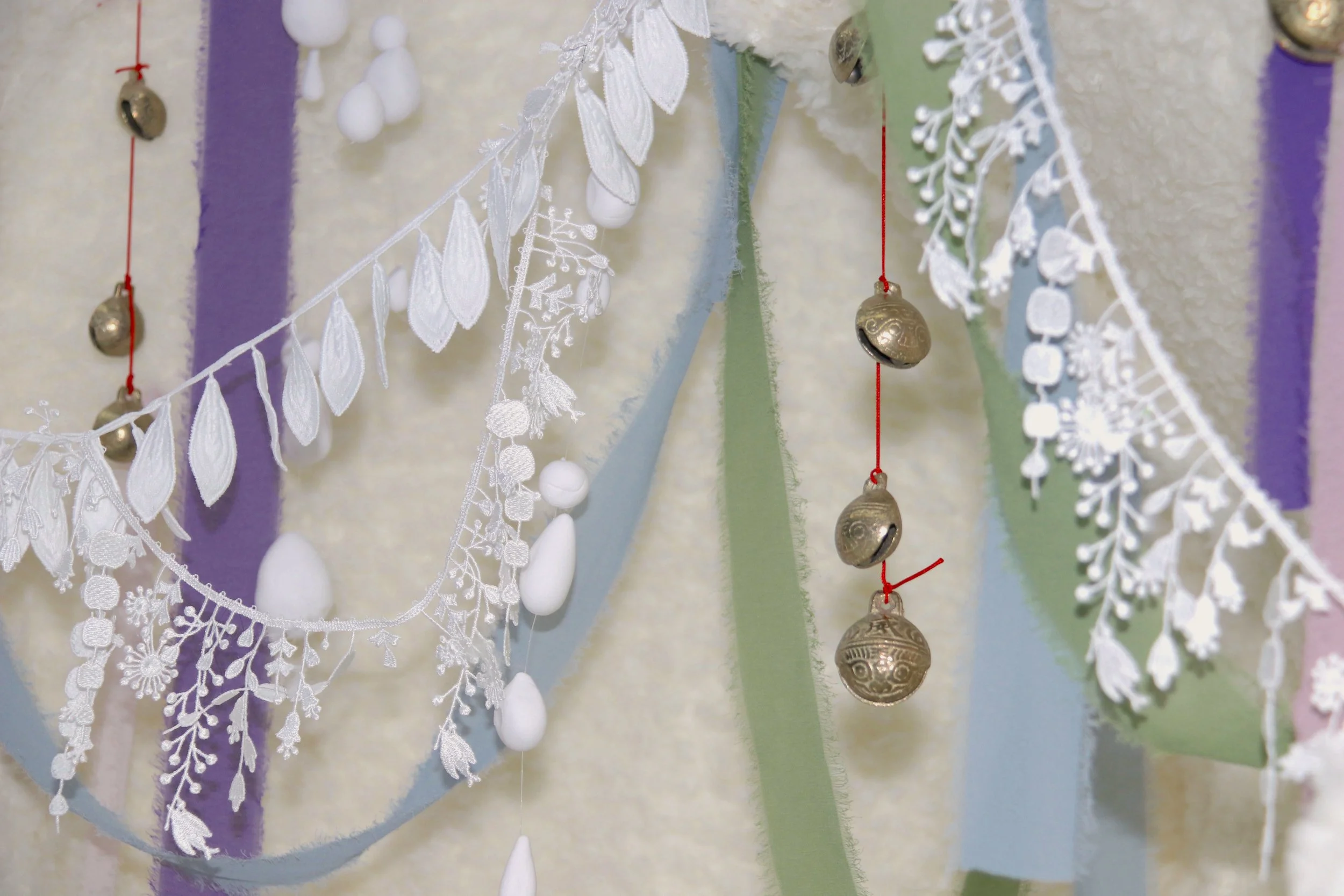 Acrylic, copper bells, fabric, lightweight clay, 3D-printed material, brainwave-activated light installation, acrylic paint, and PVC aluminium composite pipe